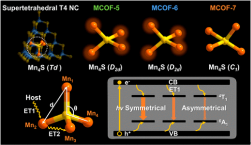 Strong Mn–Mn coupling interactions (dipole–dipole and spin–exchange), predominantly determined by statistically and apparently short Mn···Mn distances in traditional heavily Mn2+-doped semiconductors, can promote energy transfer within randomly positioned and close-knit Mn2+ pairs. However, the intrinsic mechanism on controlling Mn2+ emission efficiency is still elusive due to the lack of precise structure information on local tetrahedrally coordinated Mn2+ ions. Herein, a group of Mn2+-containing metal–chalcogenide open frameworks (MCOFs), built from [Mn4In16S35] nanoclusters (denoted T4-MnInS) with a precise [Mn4S] configuration and length-variable linkers, were prepared and selected as unique models to address the above-mentioned issues. MCOF-5 and MCOF-6 that contained a symmetrical [Mn4S] core with a D2d point group and relatively long Mn···Mn distance (∼3.9645 Å) exhibited obvious red emission, while no room-temperature PL emission was observed in MCOF-7 that contained an asymmetric [Mn4S] configuration with a C1 point group and relatively short Mn···Mn distance (∼3.9204 Å). The differences of Mn–Mn dipole–dipole and spin–exchange interactions were verified through transient photoluminescent spectroscopy, electron spin resonance (ESR), and magnetic measurements. Compared to MCOF-5 and MCOF-6 showing a narrower/stronger ESR signal and longer decay lifetime of microseconds, MCOF-7 displayed a much broader/weaker ESR signal and shorter decay lifetime of nanoseconds. The results demonstrated the dominant role of distance-directed Mn–Mn dipole–dipole interactions over symmetry-directed spin–exchange interactions in modulating PL quenching behavior of Mn2+ emission. More importantly, the reported work offers a new pathway to elucidate Mn2+-site-dependent photoluminescence regulation mechanism from the perspective of atomically precise nanoclusters.