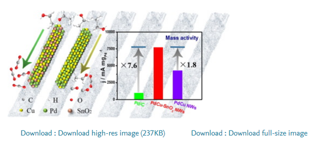 At present, although a large number of palladium-based nanowire electrocatalysts have been prepared, there are few reports on nanowires containing rich metal oxides. Herein, porous PdCu alloy nanowires and PdCu-SnO2 nanowires were prepared by using a galvanic displacement synthesis method. Due to their one-dimensional structure, rough surfaces with non-homogeneous edges, electronic effect, and the advanced PdCu/SnO2 interface of the as-synthesized PdCu-SnO2nanowire catalysts, they exhibited a mass activity of 7770.0 mA mg−1 towards ethanol oxidation, which was 7.6-fold higher than that of Pd/C catalysts (1025.0 mA mg−1). In addition, they behaved strong durability upon chronoamperometry and continuous cyclic voltammetry tests. The electrochemical measurements demonstrated that SnO2 was introduced into the PdCu/SnO2 interface, which promoted the oxidation of ethanol at a lower potential and accelerated the oxidation of Pd-COads via SnO2-OHads to regenerate the active sites. This research highlights the significance of introducing metal oxides into the nanostructure interface, and the performance of Pd-containing catalysts towards ethanol oxidation reaction was greatly improved.