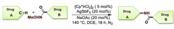 The development of new methods to achieve the direct synthesis of bioactive organic molecules is always an important topic in organic synthesis. We hereby demonstrate that N-methoxyamide is an excellent amino source in the iridium-catalyzed intermolecular C–H amination reaction. The linkage of two bioactive organic molecules can be well achieved with this new protocol. More than 20 examples of decorated bioactive compounds were reported, which can facilitate the discovery of new bioactive molecules.