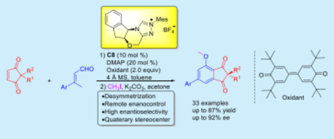 A chiral N-heterocyclic-carbene-catalyzed cascade asymmetric desymmetrization reaction of cyclopentenediones with enals has been successfully initiated, followed with tandem aldol annulation, aromatization, as well as sequential methylation. The reactions proceeded well under mild reaction conditions, with broad substrate scope and good functional group tolerance, providing a rapid access to highly functionalized chiral 2,2-disubstituted 1,3-indandione derivatives containing an all-carbon quaternary stereogenic center in moderate to good yields with high enantioselectivities.