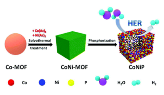 The development of high-efficiency nonprecious electrocatalysts based on inexpensive and Earth abundant elements is of great significance for renewable energy technologies. Group VIII transition metal phosphides (TMPs) gradually stand out due to their intriguing properties including low resistance and superior catalytic activity and stability. Herein, we adopt a unique MOF-derived strategy to synthesize transition metal phosphide nanoboxes which can be employed as electrocatalysts for the hydrogen evolution reaction. During this process, we converted a Co-MOF to a CoNi-MOF by ion exchange and low-temperature phosphating to achieve CoNiP nanoboxes. The CoNiP nanoboxes can reach a current density of 10 mA cm−2 at a low overpotential of 138 mV with a small Tafel slope of 65 mV dec−1.