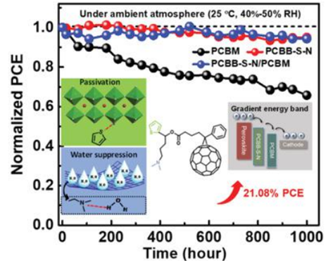 The poor long‐term stability of organic–inorganic hybrid halide perovskite solar cells (pero‐SCs) remains a big challenge for their commercialization. Although strategies such as encapsulation, doping, and passivation have been reported, there remains a lack of understanding of the water resistance and thermal stability of pero‐SCs. A fullerene derivative, [6,6]‐phenyl‐C61‐butyric acid‐N,N‐dimethyl‐3‐(2‐thienyl)propanam ester (PCBB‐S‐N) containing a functional sulfur atom and C60, is synthesized and employed as electron transporting layer (ETL)/intermediary layer to targetedly heal the multitype defects in pero‐SCs or assist the growth of ETL, such as [6,6]‐phenyl‐C61‐butyric acid methyl ester (PCBM), in planar p‐i‐n pero‐SCs. The repaired pero‐SCs can not only dramatically improve their power conversion efficiencies, but also address stability issues under moisture and high temperature. The corresponding mechanism of PCBB‐S‐N with targeted therapy effect in a device is systematically investigated by both experiments and theoretical calculation. This work demonstrates that the proposed fullerene derivative with finely tuned chemical structure can be a promising ETL candidate or intermediary to approach stable and efficient planar p‐i‐n pero‐SCs.