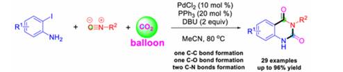 A Pd-catalyzed insertion and cycloaddition of CO2 and isocyanide into 2-iodoanilines under atmospheric pressure has been developed and affords quinazoline-2,4(1H,3H)-diones through the formation of new C–C, C–O, and C–N bonds under mild conditions. This reaction provides a new and practical method not only for the construction of quinazoline-2,4(1H,3H)-diones but also for the efficient utilization of carbon dioxide.