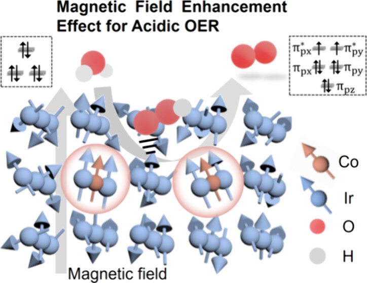 Abstract: Magnetic field mediated magnetic catalysts provide a powerful pathway for accelerating their sluggish kinetics toward the oxygen evolution reaction (OER) but remain great challenges in acidic media. The key obstacle comes from the production of an ordered magnetic domain catalyst in the harsh acidic OER. In this work, we form an induced local magnetic moment in the metallic Ir catalyst via the significant 3d–5d hybridization by introducing cobalt dopants. Interestingly, CoIr nanoclusters (NCs) exhibit an excellent magnetic field enhanced acidic OER activity, with the lowest overpotential of 220 mV at 10 mA cm–2 and s long-term stability of 120 h under a constant magnetic field (vs 260 mV/20 h without a magnetic field). The turnover frequency reaches 7.4 s–1 at 1.5 V (vs RHE), which is 3.0 times higher than that without magnetization. Density functional theory results show that CoIr NCs have a pronounced spin polarization intensity, which is preferable for OER enhancement.