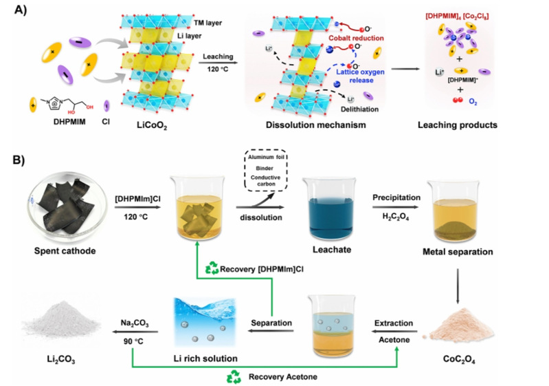 Abstract: The recycling of spent lithium-ion battery (LIB) cathodes is crucial to ensuring the sustainability of natural resources and environmental protection. The current pyrometallurgical and hydrometallurgical recycling strategies involve high energy processing and expensive reagent consumption, raising both environmental and economic concerns. Here we demonstrate a green and recyclable process using an ionic liquid (IL), 1-(2,3-dihydroxypropyl)-3-methylimidazolium chloride (imidazolium glycol). This IL induces the reduction and dissolution of transition metal ions from LIB cathodes. For a lithium cobalt oxide cathode, we demonstrate very high leaching efficiencies of 100% for Li and 99.62% for Co. X-ray diffraction and thermogravimetric-mass spectroscopy show that our imidazolium glycol preferentially dissolves lithium and induces lattice oxide anions (O2-) to reduce insoluble high-valent Co(III) to soluble Co(II) complexes. This imidazolium glycol-based process avoids noxious gas emissions and the imidazolium glycol is also easily recycled, which shows both economic and environmental advantages. Our process provides environmentally friendly and sustainable recycling of LIB cathodes and offers a suitable pathway for industrial-scale recycling.