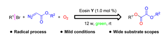 The synthesis of oxalate esters through a radical process, rather than the traditional ionic reaction, has been well developed in which the radicals induced by visible light are trapped by molecular oxygen and diazo compounds under room temperature. This reaction is operationally simple, mild, and shows broad substrate scopes in α-bromo ketones and diazo compounds.