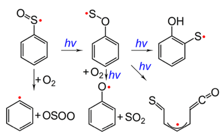 Arylsulfinyl radicals are key intermediates in sulfoxide chemistry. The parent molecule, phenylsulfinyl radical PhSO•, has been generated for the first time in the gas phase through high-vacuum flash pyrolysis of PhS(O)R (R = CF3 and Cl) at about 1000 K. Upon UV light irradiation (365 nm), PhSO• isomerizes to novel oxathiyl radical PhOS• in cryogenic matrices (2.8 K). Prolonged irradiation causes further isomerization of PhOS• to 2-hydroxyphenylthiyl radical, the formation of which has been also observed in the 193 nm laser photolysis of matrix-isolated 2-hydroxybenzenethiol. Concomitantly, ring-opening occurs during the UV photolysis of PhOS• and 2-hydroxybenzenethiol and forms an acyclic thioketoketene radical. Phenylsulfinyl radical reacts partially with molecular oxygen in the gas phase and yields phenyl radical Ph• and OSOO. Upon irradiation (365 nm), the isomeric oxathiyl radical also combines O2 with immediate dissociation to phenoxy radical PhO• and SO2. The identification of the intermediates with IR and UV–vis spectroscopy is supported by quantum chemical computations at the B3LYP/def2-TZVPP and UCCSD(T)/aug-cc-pV(D+d)Z levels of theory. The isomerization of PhSO• has been discussed based on the computed potential energy profile and the comparison with the intensively explored photochemistry of phenylperoxy radical PhOO•.