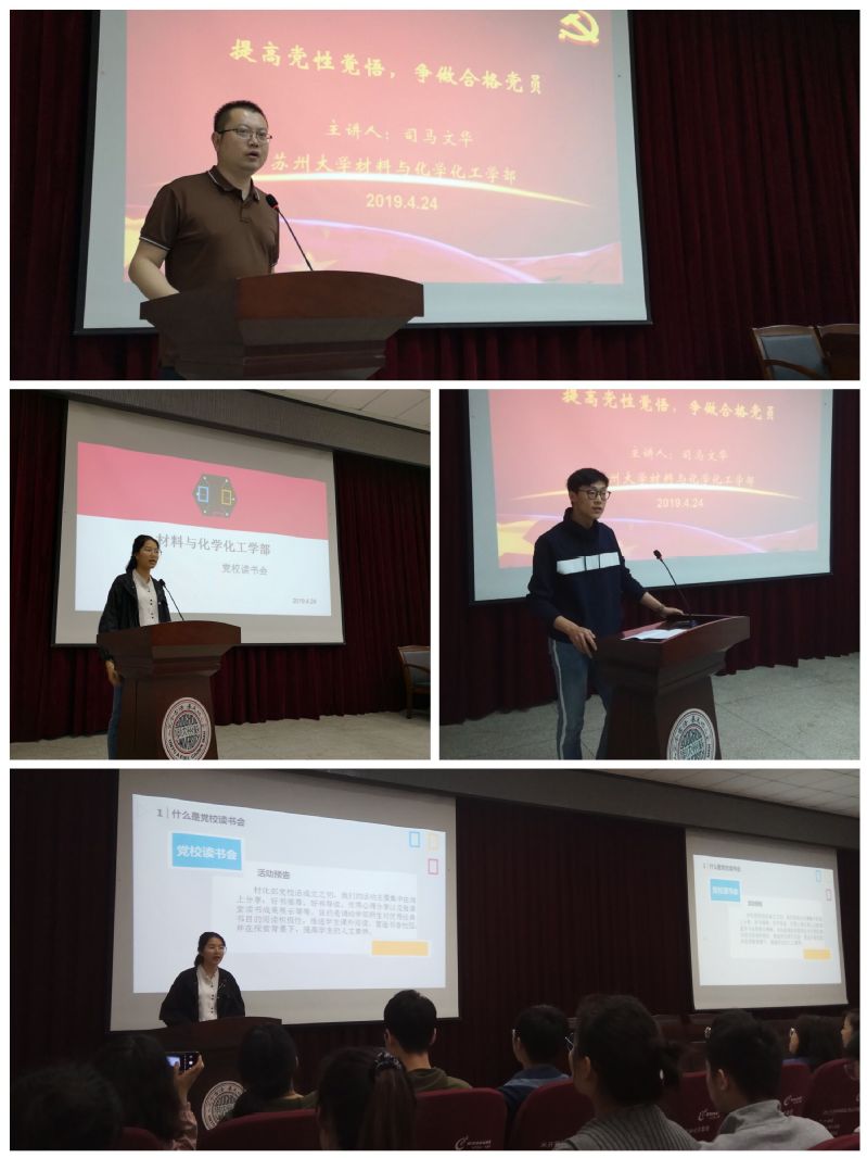 2019年4月24日12时30分,材料与化学化工学部分党校在独墅湖校区907幢1101室组织了题为《提高党性觉悟,争做合格党员》的专题微党课,学工办主任司马文华老师围绕党的先进性,讲述了作为一名党员或入党积极分子应该具有的党性修养,强调了为人民服务的重要性,引导学员们弘扬勇于担当、乐于奉献的精神,同时司马老师还围绕分党校的各项规章制度和党员发展的流程,要求学员们加强纪律意识,努力成为一名合格的中共党员。在此次培训中党校读书会负责人陈敏铭向大家介绍了读书会的基本情况及工作安排,为学员们提供了丰富的读书活动;研究生党员张程也上台进行了交流了他成为中共党员的心路历程,通过自身经历为学员们阐明了信仰对于党员的重要性,告诉学员们要端正入党态度,不忘初心,在学习、工作、生活等各方面践行为人民服务的宗旨,处处争当楷模。