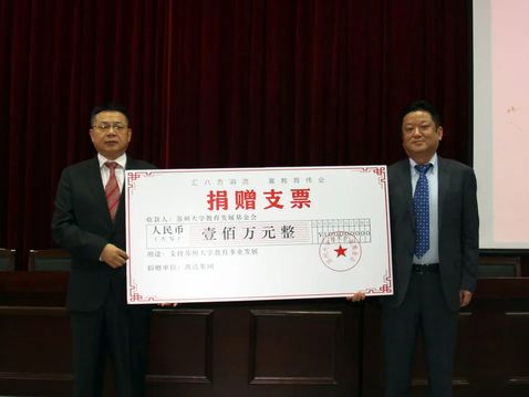 钦瑞良和陆岸分别代表凯达集团和苏州大学,交接“凯达”奖学金第二轮100万元捐赠支票。姚建林为钦瑞良董事长颁发捐赠证书,回赠校徽纪念品。