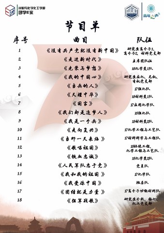 比赛正式开始,研究生高分子1、高分子2、材料党支部带来第一首曲目《没有共产党就没有新中国》,同学们认真的表情和激昂的歌声得到在场评委和老师一致好评;学部学生组织主席团以一首《走进新时代》歌颂这最好的新时代;紧接着2018级化学类一队用《光荣与梦想》唱出中国儿女的血性,唱出青春的信仰;研究生应化、无机、有机党支部带来《我的中国心》献给我最亲爱的祖国;2017级强化队用铿锵有力的音调和磅礴的气势唱出了《当兵的人》,也唱出了他们对士兵的尊重与崇拜;2018级材料类一队的《天耀中华》,唱出了对祖国繁荣昌盛的渴望和兴奋;2017级应用化学队的歌曲《国家》唱出华夏沸热血,唱出万众扬风帆;2018级强化队用《我们都是追梦人》表达出脚踏实地追求梦想的愿望;2018级材料二队的《我是一个兵》,表达着2018级材料班对军旅生活的敬佩之情。