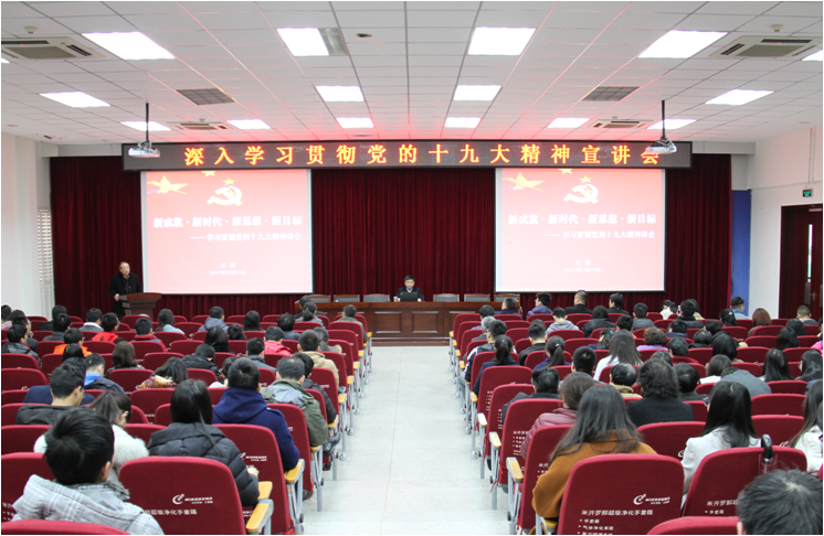 江涌书记首先指出党的十九大是在全面建成小康社会决胜阶段,中国特色社会主义进入新时代的关键时期召开的一次十分重要的大会。他从党的十九大的主要议程、主要成果和关键词三个方面,介绍了党的十九大和十九大报告的基本情况。从“新成就”“新时代”“新思想”“新目标”四个关键词深入分析阐述了党的十九大报告的核心要义。