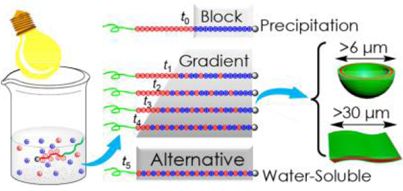 We herein present sequence-controlled polymerization induced self-assembly (PISA) via photoswitchable reversible addition fragmentation chain transfer (RAFT) copolymerization of oppositely-charged monomers using polyethylene glycol chain transfer agent in water at 25 degrees C. Thorough block copolymerization leads to a polymerization-induced electrostatic self-assembly named ABC-mode polymerization-induced electrostatic self-assembly (PIESA), by which PEGylated (PEG, polyethylene glycol) polyion complex (PIC) spheres, lamellae, and vesicles are achieved. We demonstrate the inherent spontaneous zwitterionic alternating copolymerization nature, which leads to the charge-dictated alternating or gradient zwitterionic sequence. As such, we developed sequence controlled synthesis of nanostructured block-gradient zwitterionic terpolymer PICs via complete zwitterionic copolymerization starting from photoswitched incomplete first polymerization, i.e., AB(BC)-mode PIESA. This sequence-controlled PISA method provides the unprecedented control of the low-dimensional polyelectrolyte complex nanostructure involving not only shape but also size and thickness of micrometer-sized ultrathin PIC vesicles and lamellae, without necessarily changing the whole chemical composition and degree of polymerization.