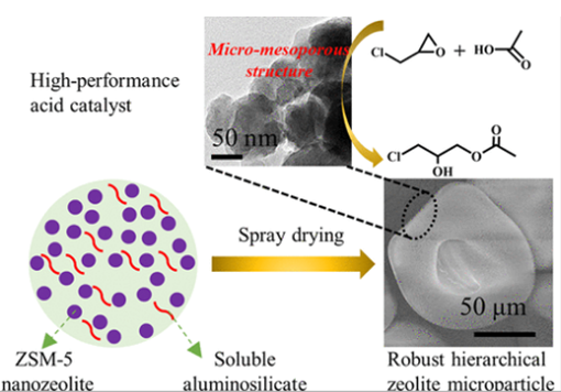 Hierarchically porous zeolites combining the advantages of desirable mass transport of nanozeolites and easy separation and handling of micro-zeolites are ideal candidates in catalytic applications. Facile routes for the assembly of zeolite microparticles with hierarchical porosity and high mechanical strength are much expected. Herein, based on a microfluidic jet spray drying technology, we report a facile and scalable chemical crosslinking assembly strategy for the synthesis of hierarchical zeolite microparticles by directly using the conventional as-synthesized nanozeolite suspension as a precursor. This route not only avoids the energy-intensive centrifugal separation process of nanozeolites but also significantly increases the uniformity and mechanical strength of the microparticles. The soluble aluminosilicate species act as a stabilizer to improve the droplet stability during the drying process and then as a “cross-linker” to chemically bind and interconnect zeolite nanoparticles to form robust bodies after drying and calcination. Zeolite microparticles with variable morphologies (spherical, bowl-like, and dimpled) and uniform and controllable sizes (from 70 to 108 μm) can be obtained by adjusting the experimental parameters. The particle formation mechanism is discussed based on the zeolite microparticles obtained from the purified nanozeolite suspension as a control. The zeolite microparticles possess emerged uniform mesopores (∼6 nm) and a well-maintained high surface area, large pore volume, high microporosity, and strong acidity of the original nanozeolites. As a result, they exhibit excellent acid catalytic performances in acetolysis of epichlorohydrin and catalytic cracking of low-density polyethylene, far better than those of the commercial ZSM-5.