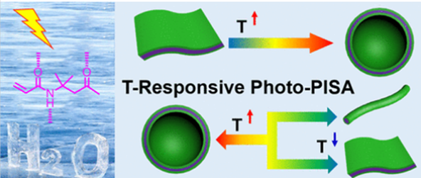 We report an updated polymerization-induced thermal self-assembly (PITSA) [Figg, C. A.; et al. Chem. Sci. 2015, 6, 1230]. The concept is validated using visible light initiated RAFT aqueous dispersion polymerization of diacetone acrylamide monomer at 25 – 70 °C. This PITSA formulation produces block copolymer lamellae at 25 °C while the copolymer morphology evolves from spheres to worms to vesicles during polymerization at 60 °C, which is above the lower critical solution chain length (LCSCL) of the core-forming block. Particle shape and size uniformity can be controlled by reaction temperature using a single photo-PISA formulation. Vesicles-to-lamellae and vesicles-to-worms transitions are achieved in situ upon cooling reaction dispersions (70 °C) to 25 °C, leading to the transformation of initially free-flowing liquids to physical hydrogels. Moreover, reversible thermoresponsive lamellae-to-vesicles-to-lamellae and worms-to-vesicles-to-worms transitions of as-synthesized nanoparticles are achieved in dilution in a heating–cooling cycle. This thermoresponsive photo-PISA formulation updates Figg’s PITSA protocol mainly in three aspects: (1) the absence of LCST limitation, (2) user-friendly control of particle shape and size uniformity by reaction temperature using a single photo-PISA formulation, and (3) reversible thermoresponsive transition of the ketone-functionalized vesicles to customer-guided lamellae or worms.