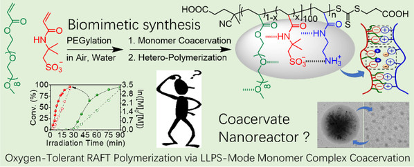 Abstract: Biomimetic synthesis represents a cutting-edge topic in chemistry/materials science. Herein, we demonstrate poly(ethylene glycol) (PEG) short side-chain-assisted monomer complex coacervation and reaction-induced polyion complex compartmentalization that lead to oxygen-tolerant polymerization-induced electrostatic self-assembly (PIESA). This is achieved by the one-pot synthesis of a PEGylated anionic polyelectrolyte and heterogeneous iterative polymerization of a cationic monomer under ecofriendly ambient, in-air aqueous photo-RAFT conditions. Simultaneous reversible all-segment-participating ternary complex coacervation and Coulombic interdomain interactions lead to coacervate nanoreactors that are capable of immediate initiation and fast reversible addition–fragmentation chain transfer reactions. Approximately 2 nm monomer complex nanoclusters act as building blocks to drive liquid–liquid phase separation. Polymerization induces hierarchical self-assembly in a droplet nucleation–fusion–fission mechanism together with PEG-crowded polyion complex compartmentalization, using nanoclusters as building blocks, mechanistically similar to liquid–liquid phase separation through supramolecular polymerization. Consequently, protein-like, one-component multicompartment coacervate nanoreactors with oxygen-tolerant well-controlled fast reactions are achieved. This work provides important implications for the efficient precise synthesis of biomimetic coacervate nanodevices of increasing complexity.