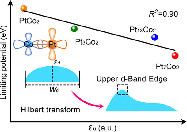 Abstract: Low-temperature direct ammonia fuel cell (DAFC) stands out as a more secure technology than the hydrogen fuel cell system, while there is still a lack of elegant bottom-up synthesis procedures for efficient ammonia oxidation reaction (AOR) electrocatalysts. The widely accepted d-band center, even with consideration of the d-band width, usually fails to describe variations in AOR reactivity in many practical conditions, and a more accurate activity descriptor is necessary for a less empirical synthesis path. Herein, the upper d-band edge, εu, derived from the d-band model, is identified as an effective descriptor for accurately establishing the descriptor–activity relationship. Using the PtCo alloy with varying atomic composition as an example, the εu value succeeds in reflecting the corresponding trends of AOR activity, showing striking linear correlation with a coefficient of determination (R2) as high as 0.90. The effectiveness of the established descriptor–activity relationship is verified experimentally. The optimum electrocatalyst delivers an excellent peak current density of 74.04 A g–1 at 5 mV s–1, and the assembled DAFC generates a high power density, outperforming the majority of the extensively reported systems. This work brings fundamental insights into the relationship between chemical reactivity and electronic structure and benefits rational optimization of AOR electrocatalyst for next-generation low-temperature DAFC.