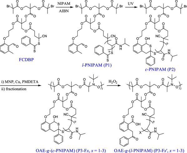 Abstract:The variations of side-chain architecture can significantly affect thethermoresponsive behaviors of graft polymers. This study is aimed at designing lineargraft polymers with linear or cyclic pendants (LGPLs/LGPCs) to elucidate the distinctthermostability of polymer solutions. Three pairs of poly(N-isopropylacrylamide)(PNIPAM)-bearing graft polymers with a weight-average graft number (Ng) up to 16are synthesized by the combination of the ring-first method, fractionation, and topologytransformation. The chain architecture and graft number can affect the thermostabilityand thermosensitivity of polymer aqueous solutions, in which thermo-induced maximalvariations of transmittance, light scattering intensity, and fluorescence intensity ratiorelated to amide−water hydrogen bonding drastically decrease with the incorporationof cyclic pendants and an increase of Ng. LGPLs with pronounced chain entanglementcan self-assemble into thermostable lamellae, while other polymer assemblies aresubjected to thermo-induced sphere-to-vesicle or vesicle-to-lamella transitions. Thisresearch affords a promising method to construct graft polymers with variable architectural parameters to achieve topology-dependent thermoresponsive behaviors.
